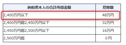 以下の国税庁の表の通り、合計所得金額によって、控除額が異なります。