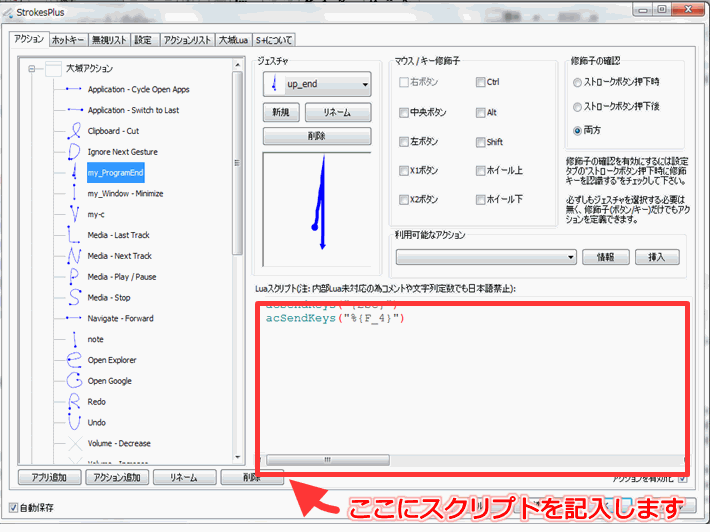 ①のLuaスクリプトの記入場所 ![]() 大切だと思うこと 例えば、デスクトップを表示したい場合は、Windowsキー + dキー を押します。この場合、Luaスクリプトには、 acSendKeys("@d") と記述します。 記述の仕方は、 acSendKeysの使い方: をご覧ください。 そうすれば、StrokesPlusから簡単に呼び出してあげることができます。 この場合は、処理が失敗する場所の前・後・前後に、acDelay(数値) と記述して処理を少し遅らせてあげると、動作が安定することが多いです。 私の環境では、次のスクリプトで動作が失敗することがありました。